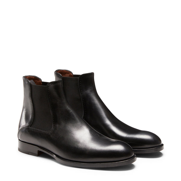 Versatile stivaletto Beatles realizzato in pelle nera liscia. Il sapiente lavoro artigianale conferisce al pellame un effetto anticato e maggiore lucentezza. La calzatura è caratterizzata da piccole bucature lungo i profili degli elastici laterali, questi ultimi garantiscono il massimo comfort nella calzata ed una perfetta vestibilità. Suola in cuoio con mezzo tacco in gomma.