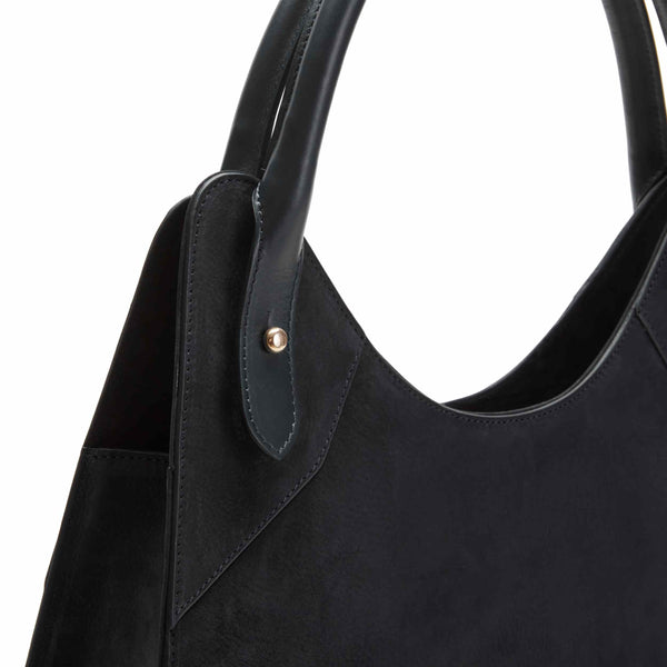 Borsa a mano della linea Emma realizzata in pelle con effetto nabuck bottalato di color blu marine. Design geometrico e strutturato, capienti e versatile per l'utilizzo quotidiano. Si caratterizza per manici che permettono sia la presa a mano che il trasporto a braccio. ll logo Fratelli Rossetti è stampato a caldo nella parte frontale della borsa. Chiusura con zip.