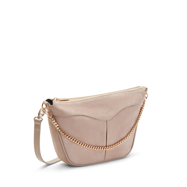 Pochette della linea Claire realizzata in raffinata pelle scamosciata color beige corda. Borsa dalle dimensioni contenute ma sufficientemente capiente da contenere gli accessori personali. Si caratterizza per il suo design morbido e per le due tracolle, in pelle e a catenella, entrambe rimovibili. Chiusura con zip.