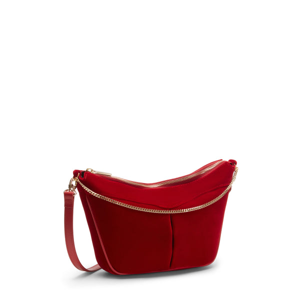 Pochette della linea Claire realizzata in raffinato velluto rosso. Borsa dalle dimensioni contenute ma sufficientemente capiente da contenere gli accessori personali. Si caratterizza per il suo design morbido e per le due tracolle, in pelle e a catenella, entrambe rimovibili. Chiusura con zip. .