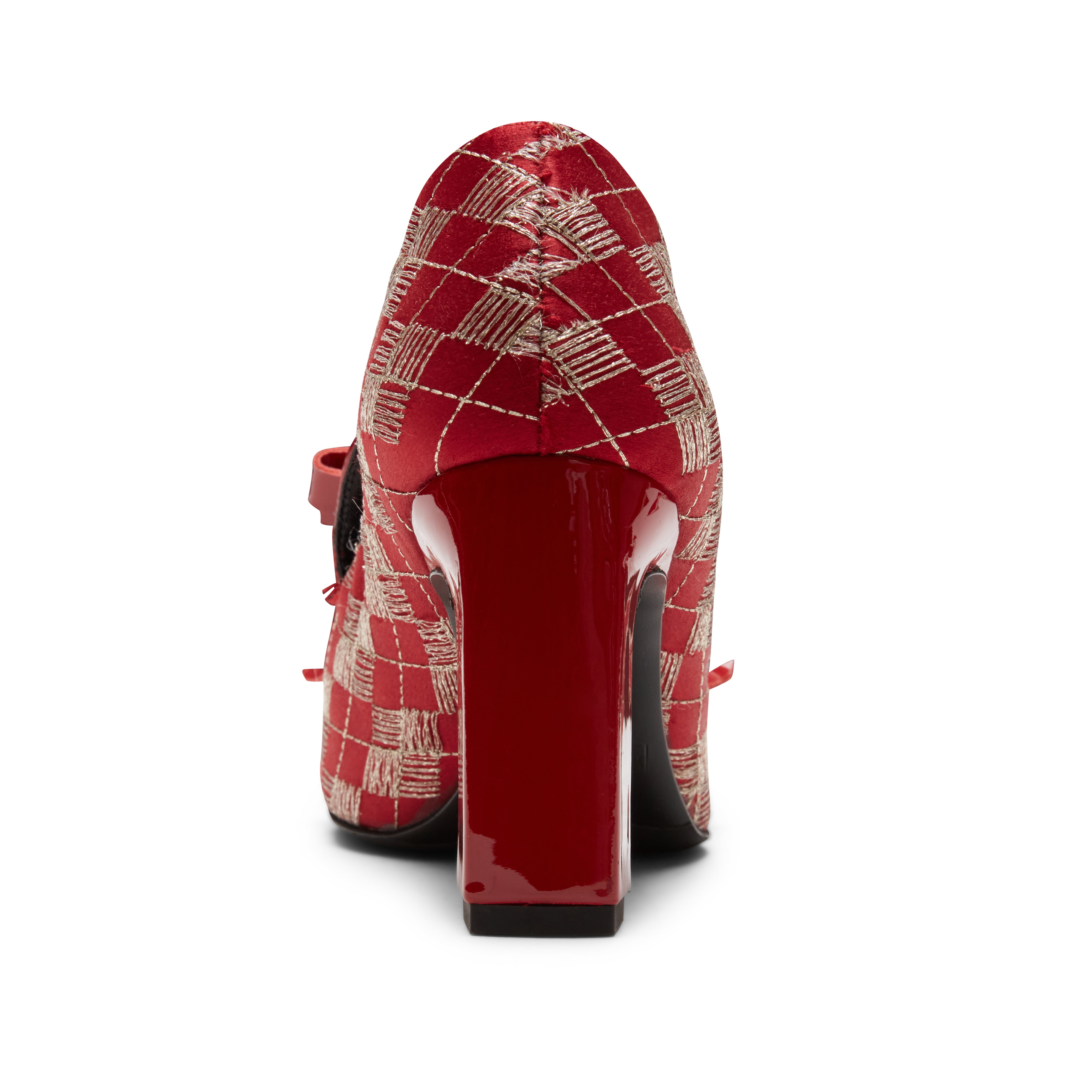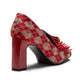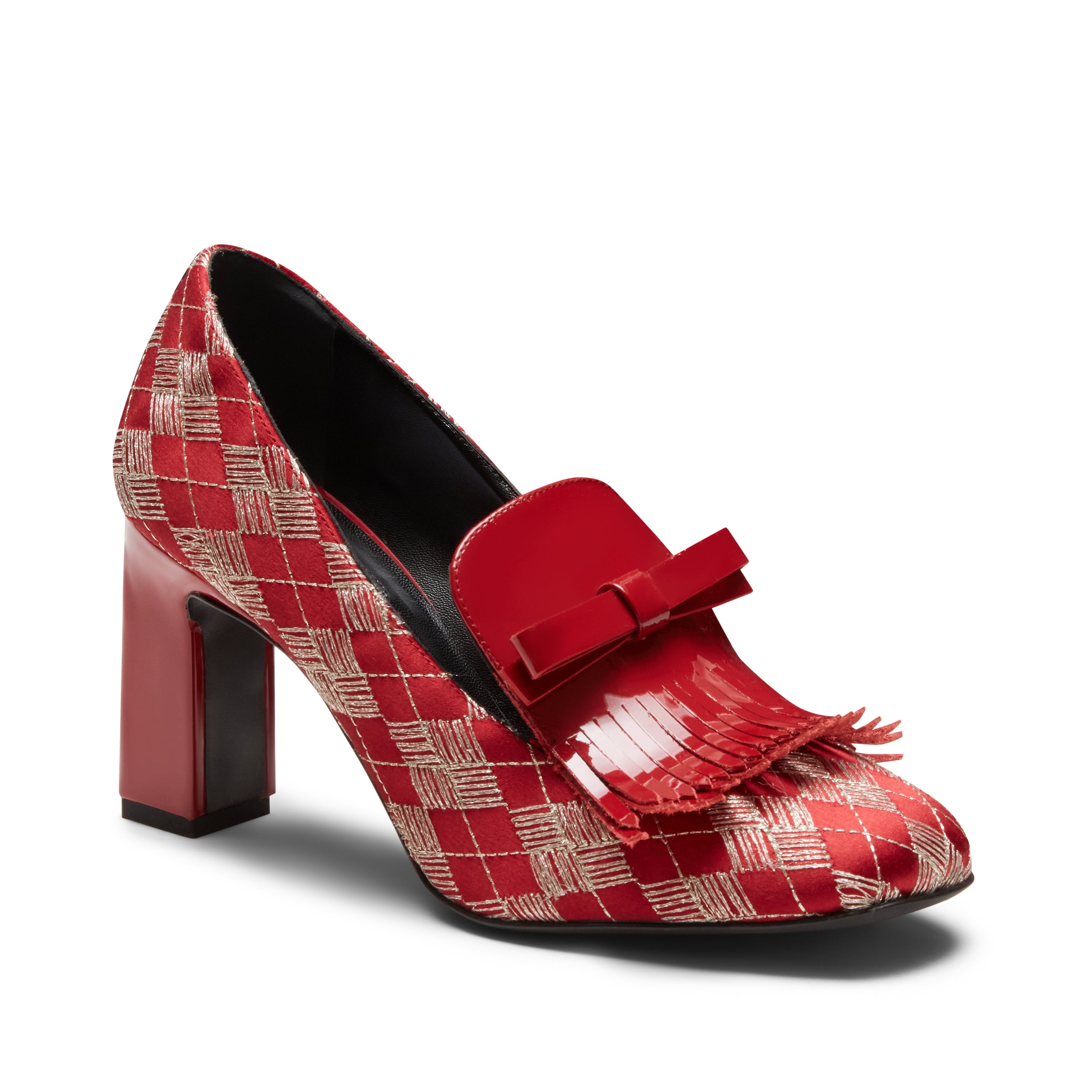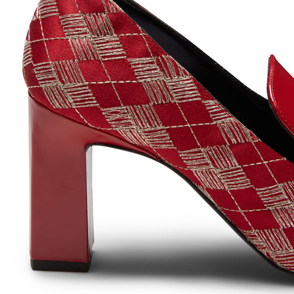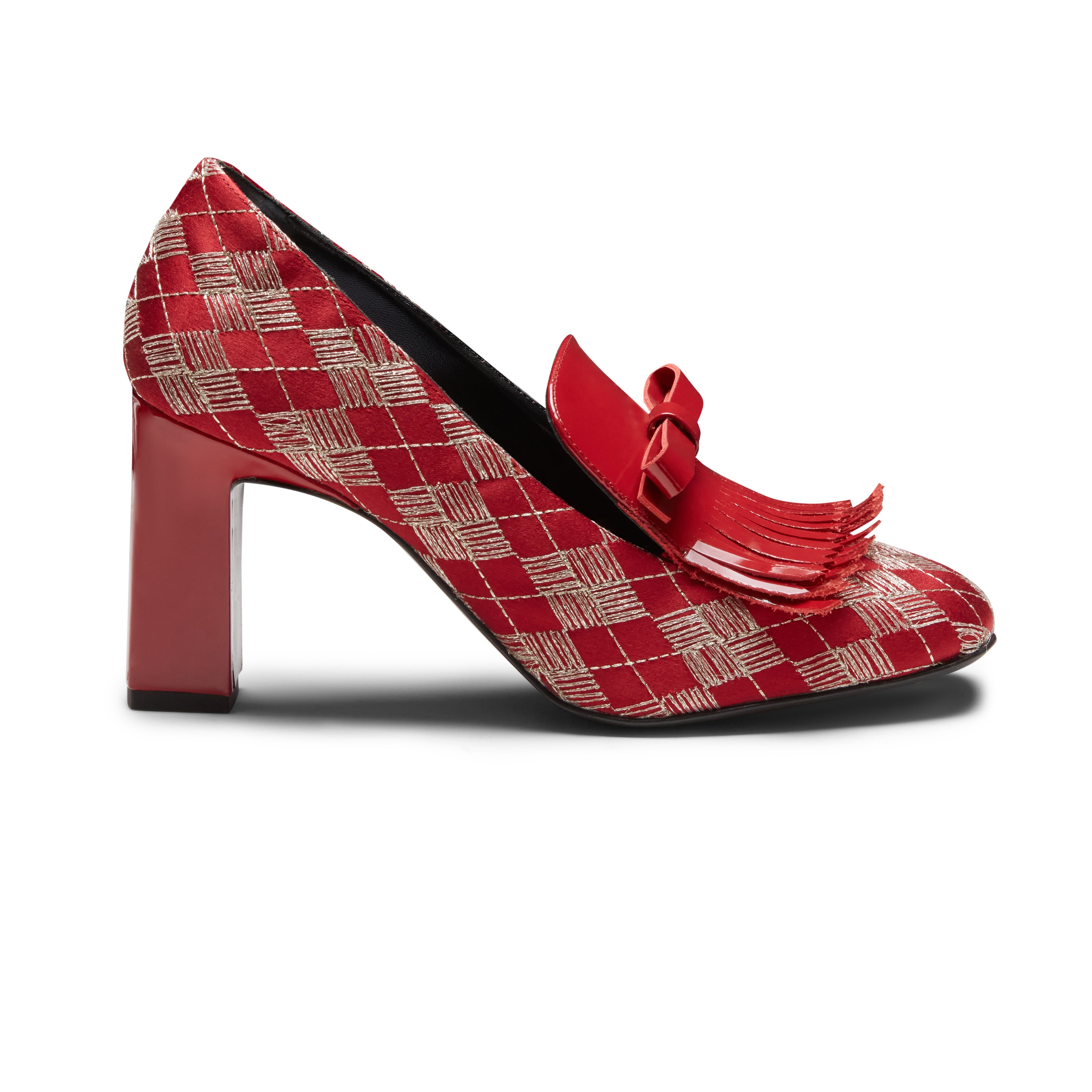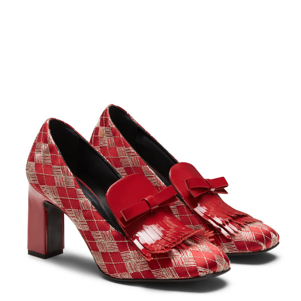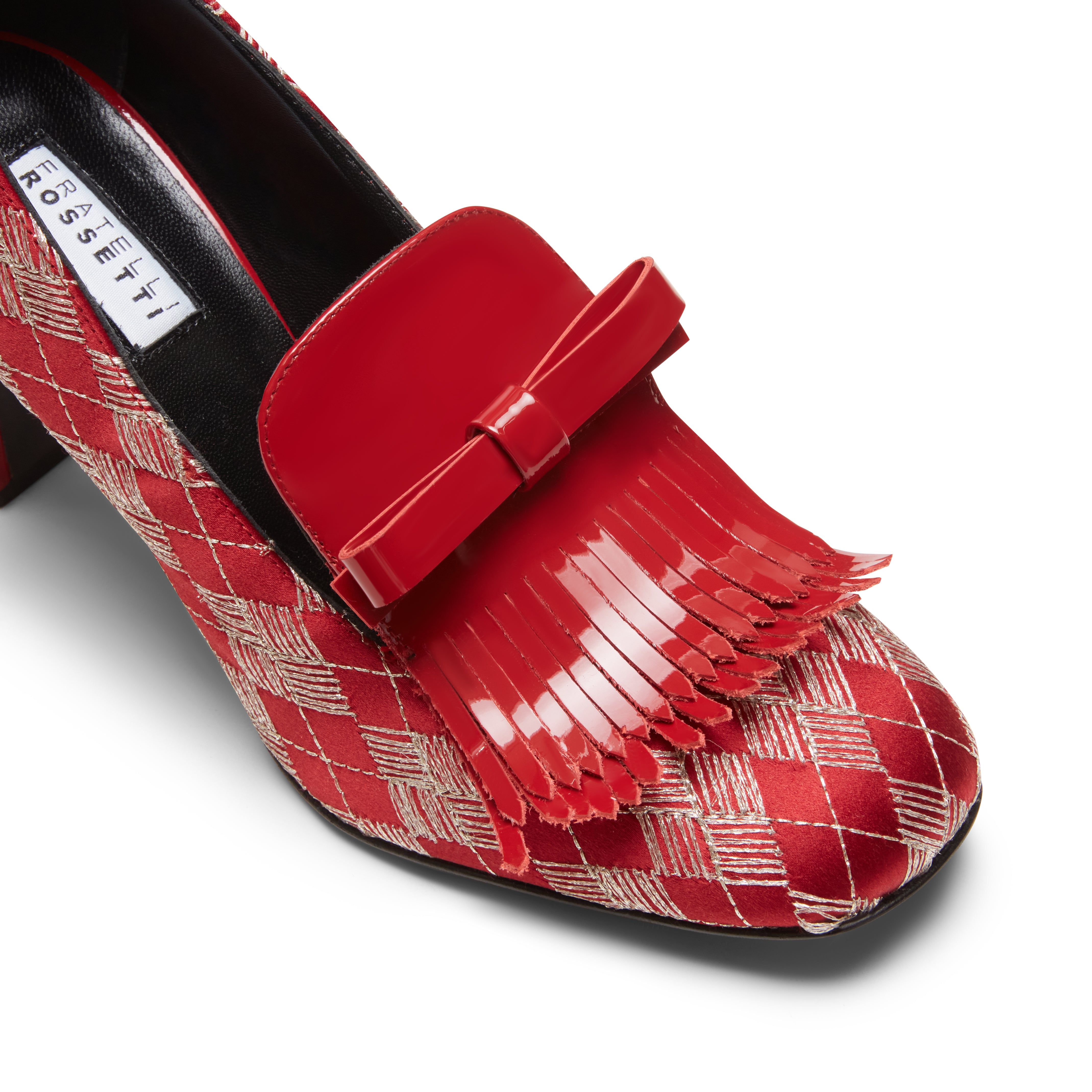 Slipper a forma squadrata declinata in tacco alto 80mm. Realizzata in velluto rosso con ricami geometrici e inserti in fili di lurex argentato, che aggiungono un tocco di luce. Si caratterizza per linee femminili e raffinati dettagli come la mascherina decorata con frangia e fiocchetto. Calzatura chic e bon ton, dona eleganza e ricercatezza. Suola in cuoio nera in tono alla fodera.