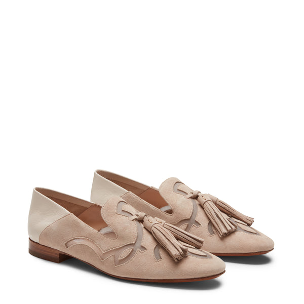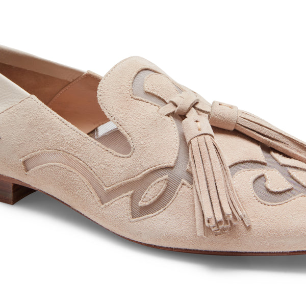 Liconica slipper Hobo in morbida pelle scamosciata beige si arricchisce di raffinate trasparenze, dove il disegno del fiore è reinterpretato con un delicato effetto vedo-non-vedo. Femminile e sofisticato, il modello è caratterizzato da tallone ripiegabile e nappe oversize tono su tono. Suola in cuoio.