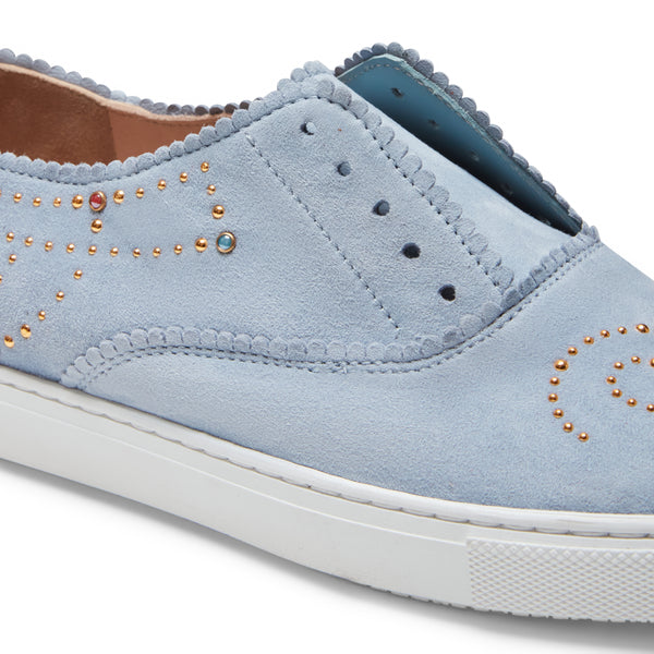 L'iconica sneaker Hobo Sport con fondo a cassetta è proposta in un'interpretazione romantica e raffinata. I dettagli di foratura sono impreziositi da piccole borchie colorate, mentre i profili smerlettati ne esaltano il design. Calzatura casual ma ricercata, è realizzata in morbida pelle scamosciata color celeste e può essere indossata anche senza lacci grazie ai pratici elastici interni, garantendo comfort e versatilità. Suola in gomma con battistrada personalizzato.