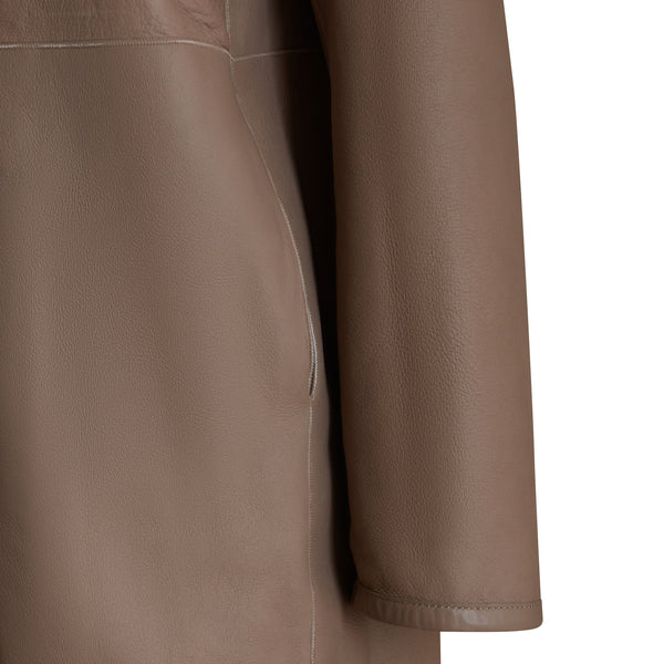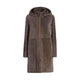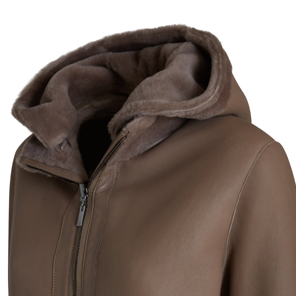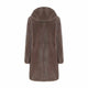 Raffinato cappotto reversibile realizzato in morbido shearling nappato in caldo color tortora. Caratterizzato da un ampio cappuccio rimovibile, le maniche lunghe sono rifinite a taglio vivo e facilmente risvoltabili. Design essenziale con chiusura centrale con zip metallica. Il capo ha una vestibilità regolare.
