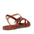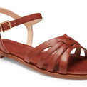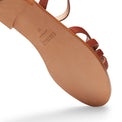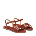 Sandalia plana de estilo elegante y artesanal fabricada en suave piel lisa color almendra. Combina comodidad y elegancia. Las bandas tejidas envuelven el pie creando patrones geométricos que recuerdan el arte de tejer. El trenzado ancho realza una estética sofisticada y natural, perfecta para el verano. Suela de cuero.