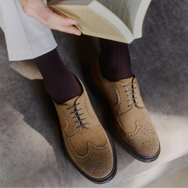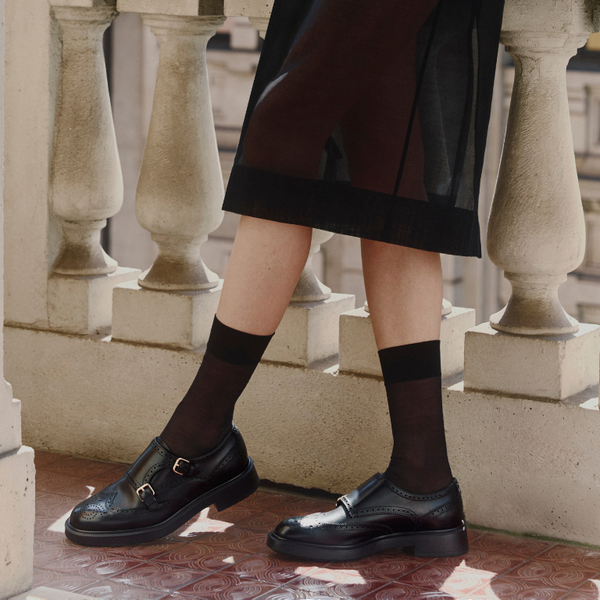 Un encanto atemporal para este zapato Derby de cuatro agujeros con puntera redonda. Realizado con piel de color ébano y acabado artesanalmente con cepillos abrasivos para acentuar su aspecto brillante y envejecido. El estilo andrógino y contemporáneo del zapato se completa con el cómodo tacón de 50 mm. Suela de cuero con media planta de goma.