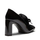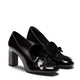 Slipper a forma squadrata declinata in tacco alto 80mm. Realizzata in vernice nera, si caratterizza per linee femminili e raffinati dettagli come la mascherina decorata con frangia e fiocchetto. Calzatura chic e bon ton, dona eleganza e ricercatezza. Suola in cuoio nera in tono alla fodera.