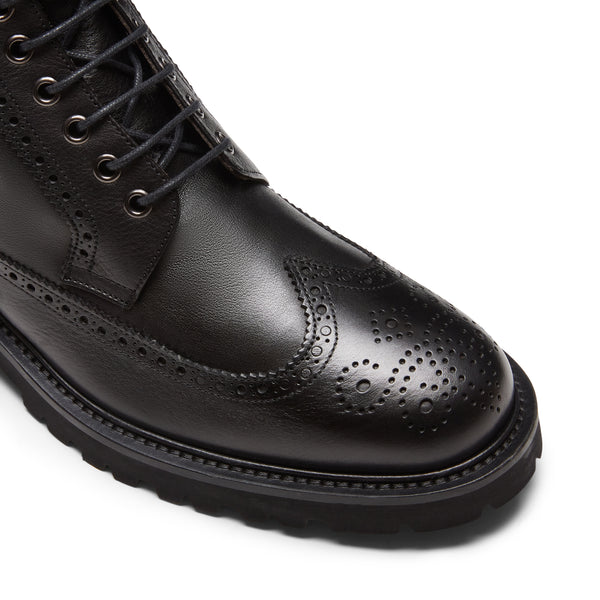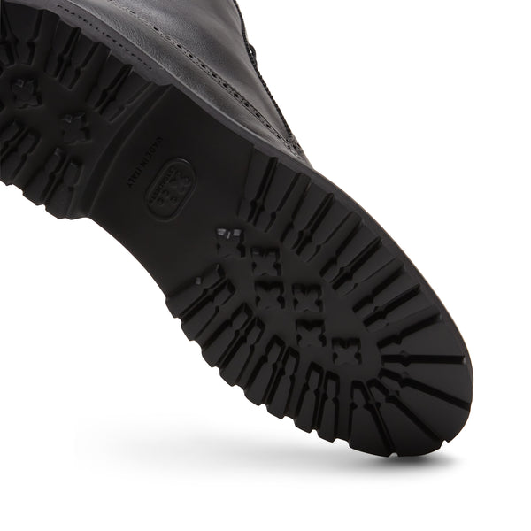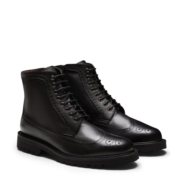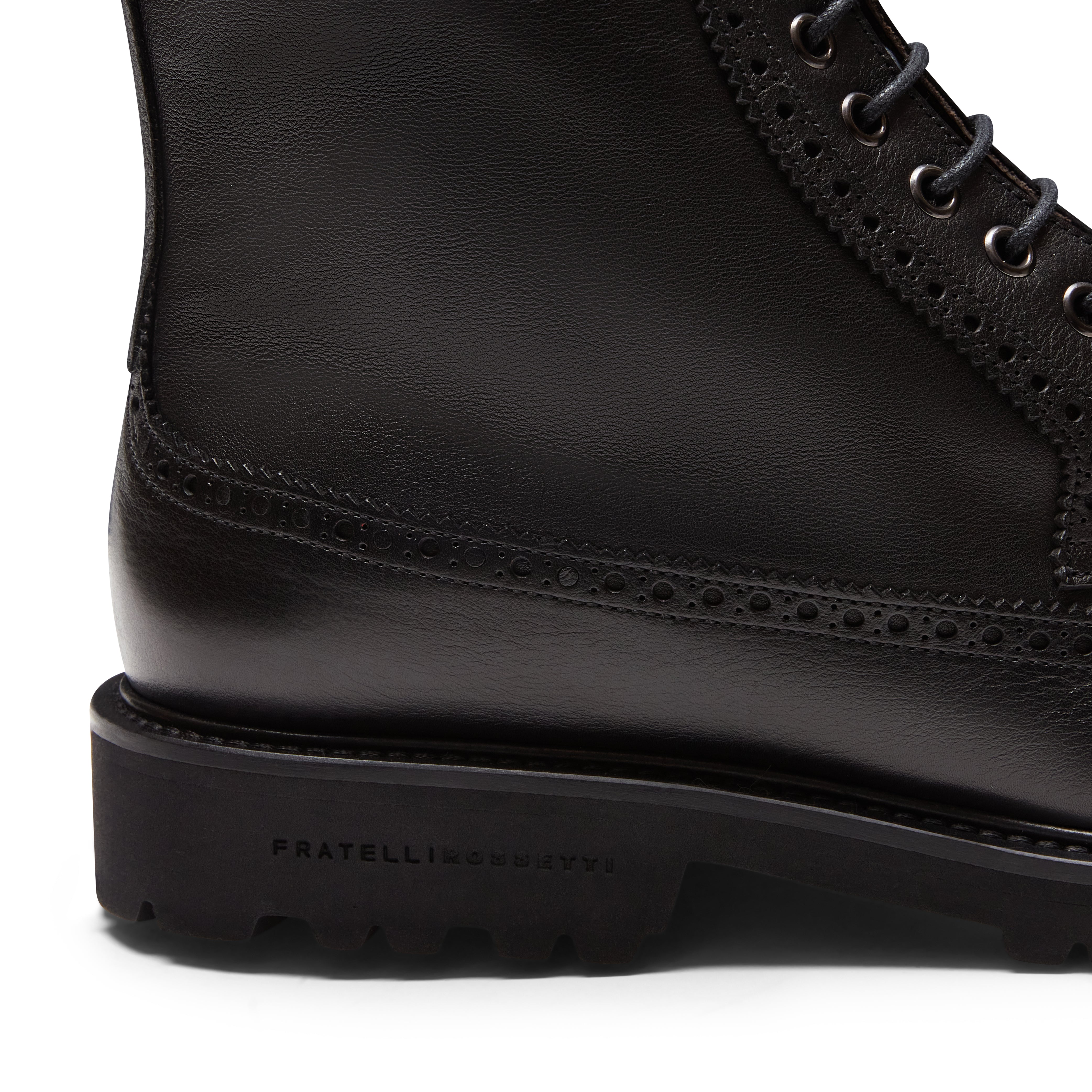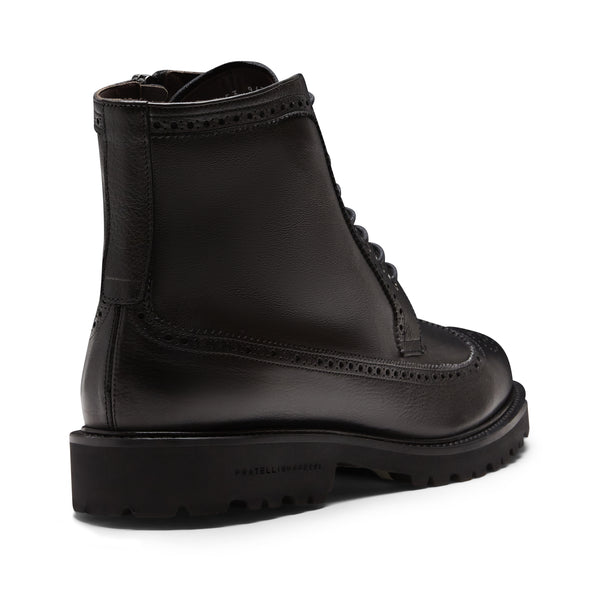 Polacco stringato brogue ispirato alle forme tradizionali anglosassoni. Realizzata in pelle liscia nera, il pellame viene tuffato nel colore e succesisvamente rifinito con spazzolatura abrasiva da sapienti mani. Calzatura che combina stile artigianale e funzionalità grazie alla suola carrarmato in gomma extralight con intersuola in cuoio.