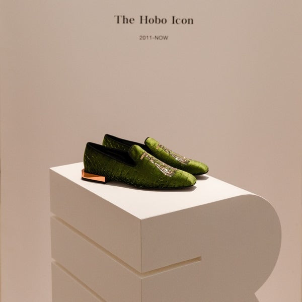 Une nouveauté intéressante pour la saison prochaine est le modèle Hobo Soirée, la version « brillante » du modèle pantoufle emblématique, réalisée avec une application de strass qui dessine la fleur en contraste de matière avec le tissu velours à imprimé crocodile. Le talon laqué or rend ces chaussures encore plus raffinées et tendance.