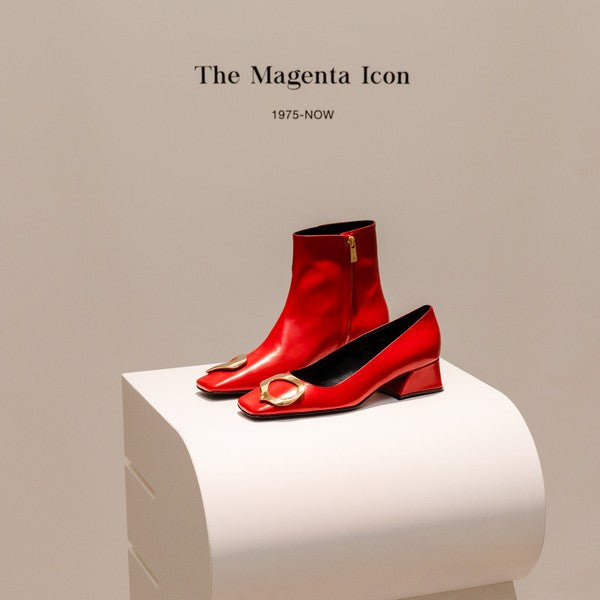 Dans ce contexte, les icônes et leurs innovations sont les protagonistes. Comme l'univers Magenta qui poursuit sa « révolution » pour la collection Automne/Hiver 2023-2024 L'emblématique étrier en métal, devenu un accessoire bijou en 2019, a été techniquement repensé en termes d'épaisseur et de taille, et orne la nouvelle bottine et le nouvel escarpin décolleté fuselé à bout carré et talon graphique.