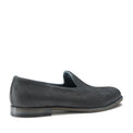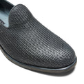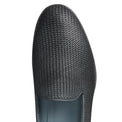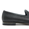 Chaussures sans lacets en cuir finement tressé et teint sur tige finie. Le cuir couleur denim est trempé dans la couleur puis fini avec des brosses abrasives par des mains expertes. La semelle en cuir est colorée à la main et cirée de la même couleur que la tige.