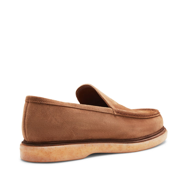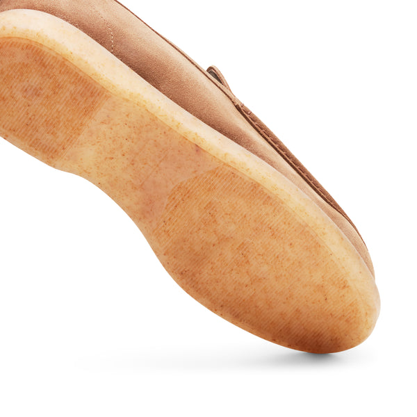 Mocassin raffiné de forme carrée et lisse en daim doux couleur castor. Chaussure déconstruite au look informel, caractérisée par des détails stylés comme la trépointe recouverte du même cuir que la tige. Semelle en caoutchouc souple et légère de couleur ambre.Art. 15130