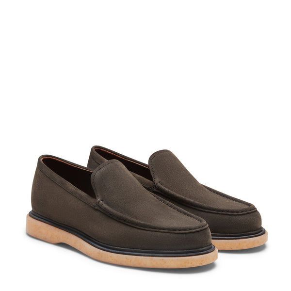 Mocassin raffiné de forme carrée et lisse en daim doux de couleur anthracite. Chaussure déconstruite au look informel qui se caractérise par des détails élégants tels que la trépointe recouverte du même cuir que la tige. Semelle en caoutchouc souple et légère de couleur ambre.Art. 15131