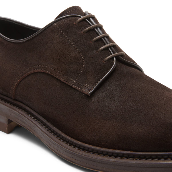 Derbies au look contemporain, inspirées des formes traditionnelles des chaussures anglo-saxonnes. Caractérisées par un liseré en cuir sur toute la tige. En daim de couleur cacao avec traitement déperlant. Semelle en gomme texturée de couleur beige avec semelle intermédiaire en cuir.