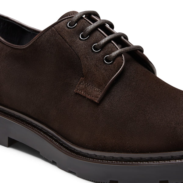 Derby à lacets avec bord accentué et forme arrondie, en daim couleur cacao. Une chaussure classique et exclusive, une combinaison parfaite d'apparence formelle et de caractère distinctif. Semelle en polyuréthane avec trépointe cousue à la main, dotée d'une couche supérieure douce et flexible pour le confort du pied, tandis que la bande de roulement assure la durabilité et une adhérence antidérapante.Art. 47208