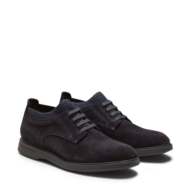 Derby a quattro fori a forma arrotondata. Questa calzatura si caratterizza per lo scollo 'a calzino' in tessuto a coste elasticizzato per una calzata confortevole. Realizzata in morbida pelle scamosciata blu marine. Suola in mescola di gomma leggera, flessibile e resistente.