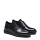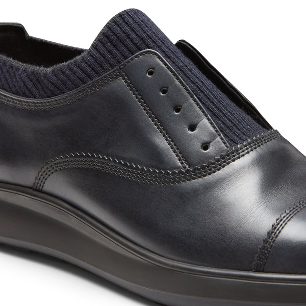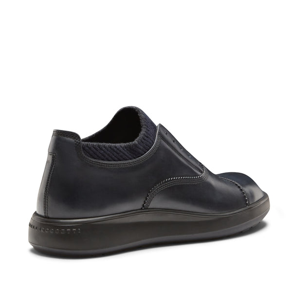 Francesina senza lacci dal look dinamico ed esclusivo. Si caratterizza per lo scollo 'a calzino' in tessuto a coste elasticizzato per una calzata confortevole. Realizzata in pelle color blu marine che si caratterizza per un'esclusiva lavorazione artigianale che dona un effetto anticato e maggiore lucentezza. Suola in mescola di gomma leggera, flessibile e resistente.