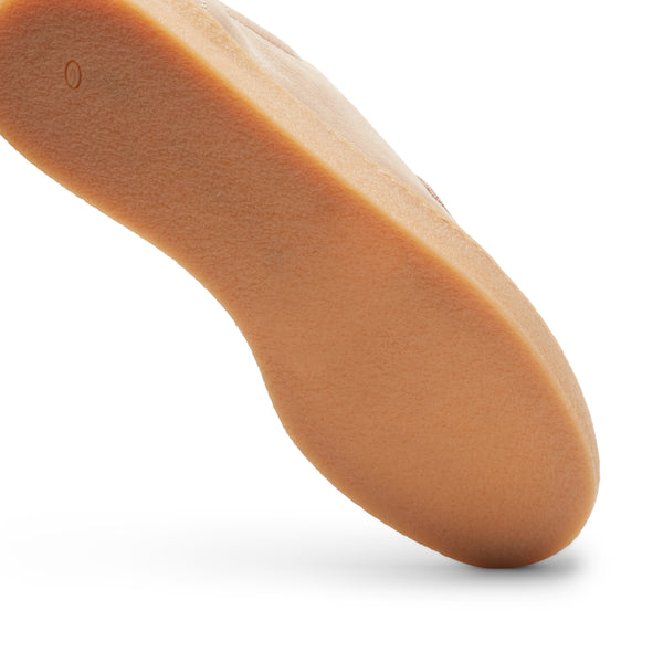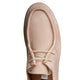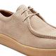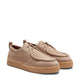 Stringata derby a due fori dalla forma arrotondata, realizzata in morbido nabuck bottalato color corda. La suola in gomma ad effetto para e la particolare costruzione a giro mocassino conferiscono alla calzatura un aspetto casual e dinamico, con una connotazione artigianale e contemporanea.