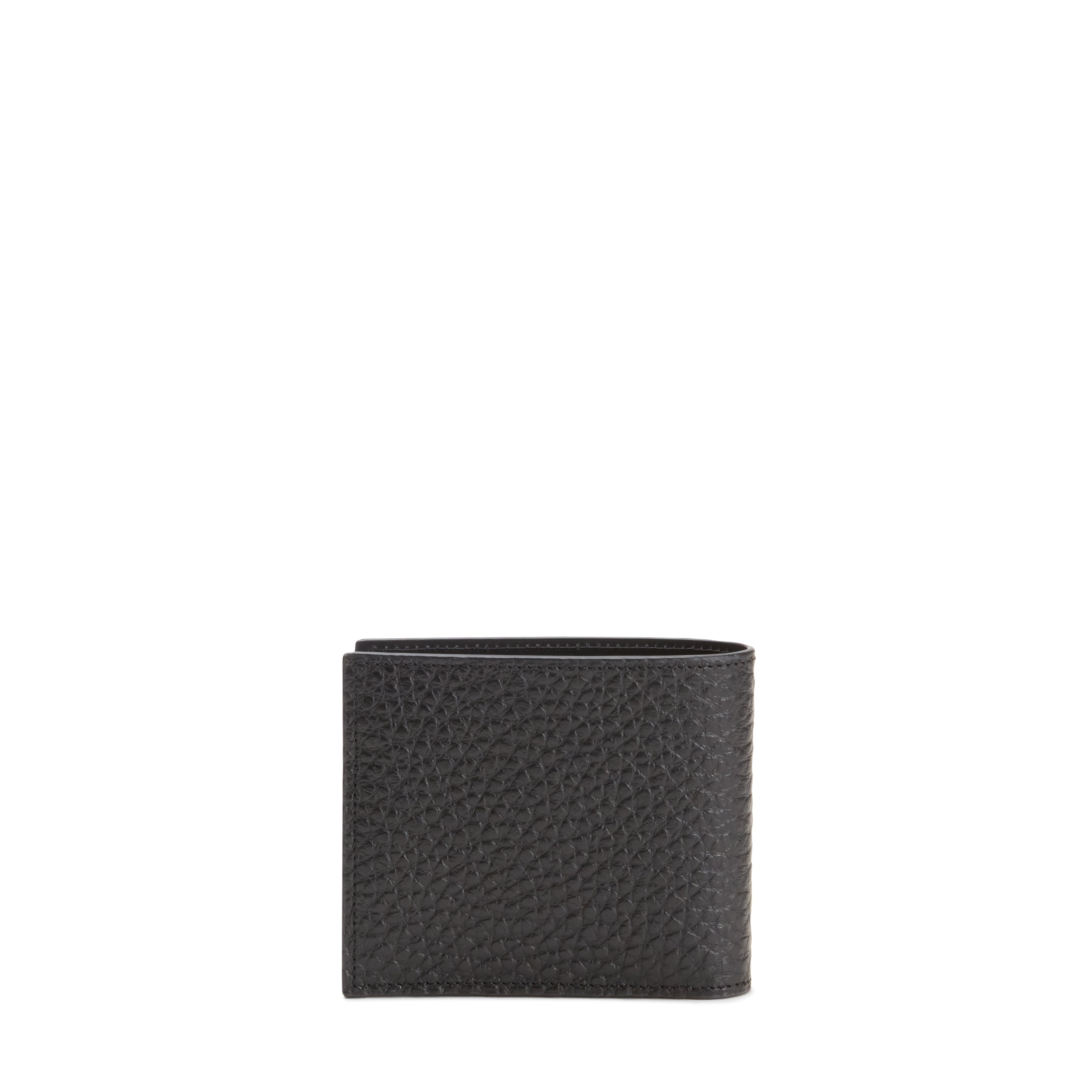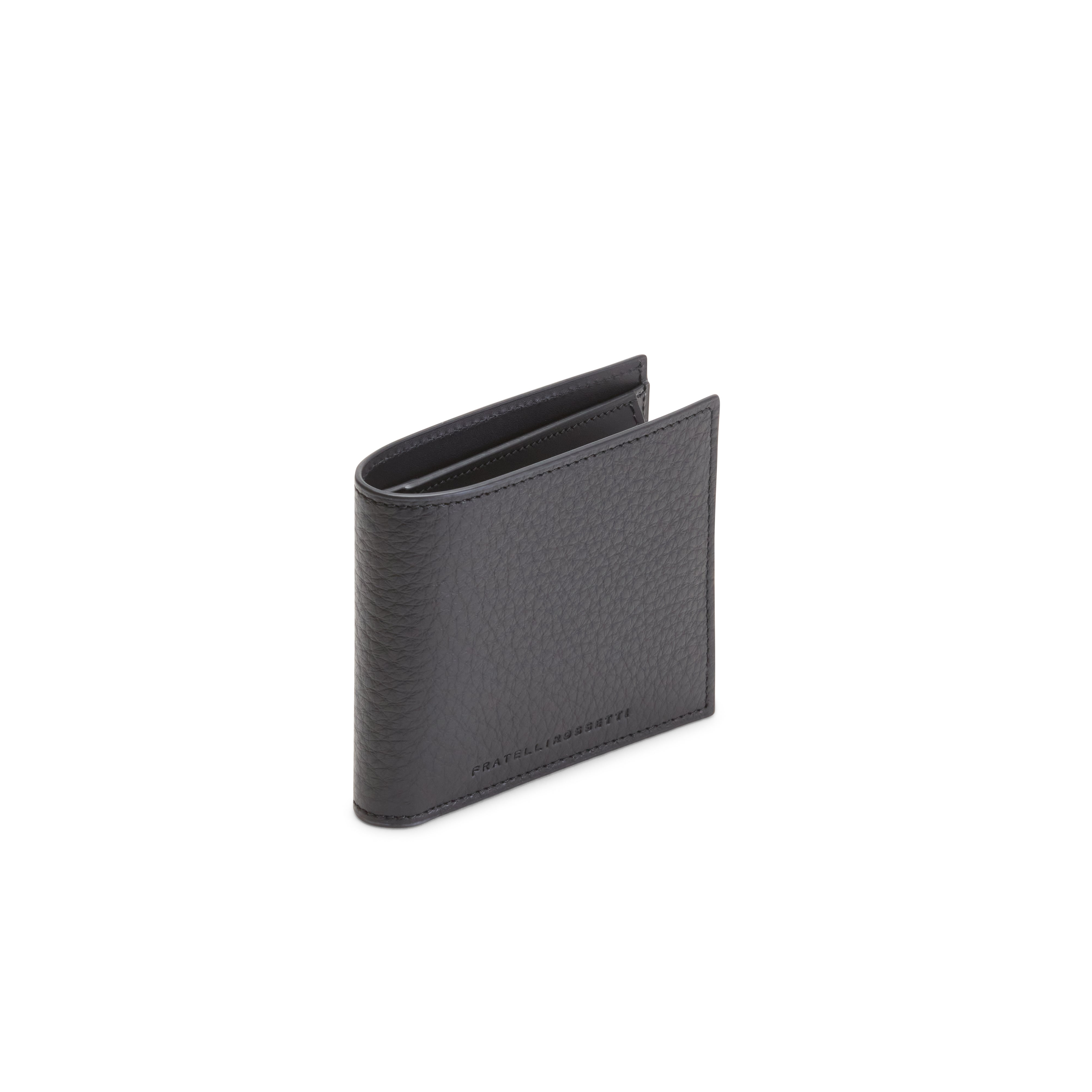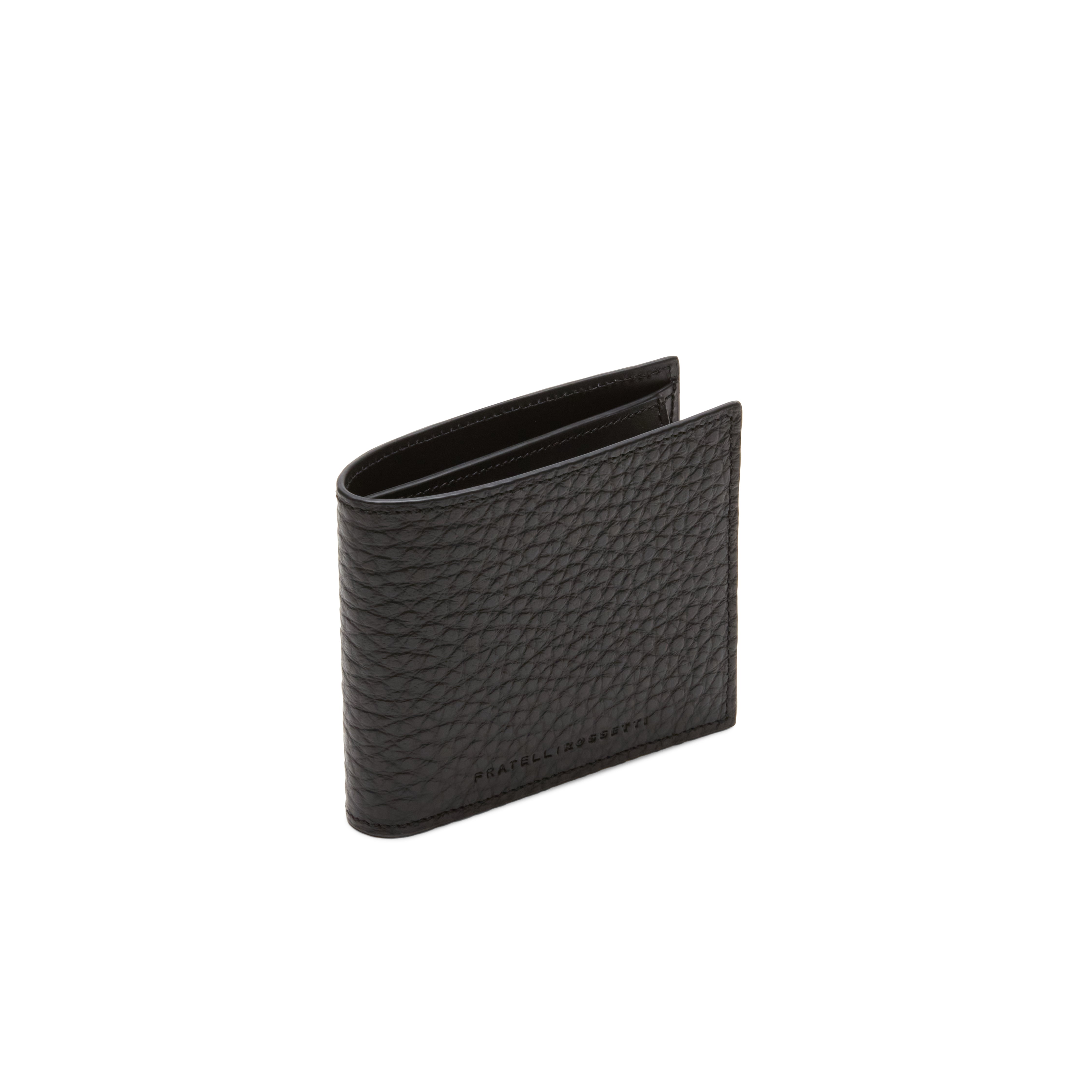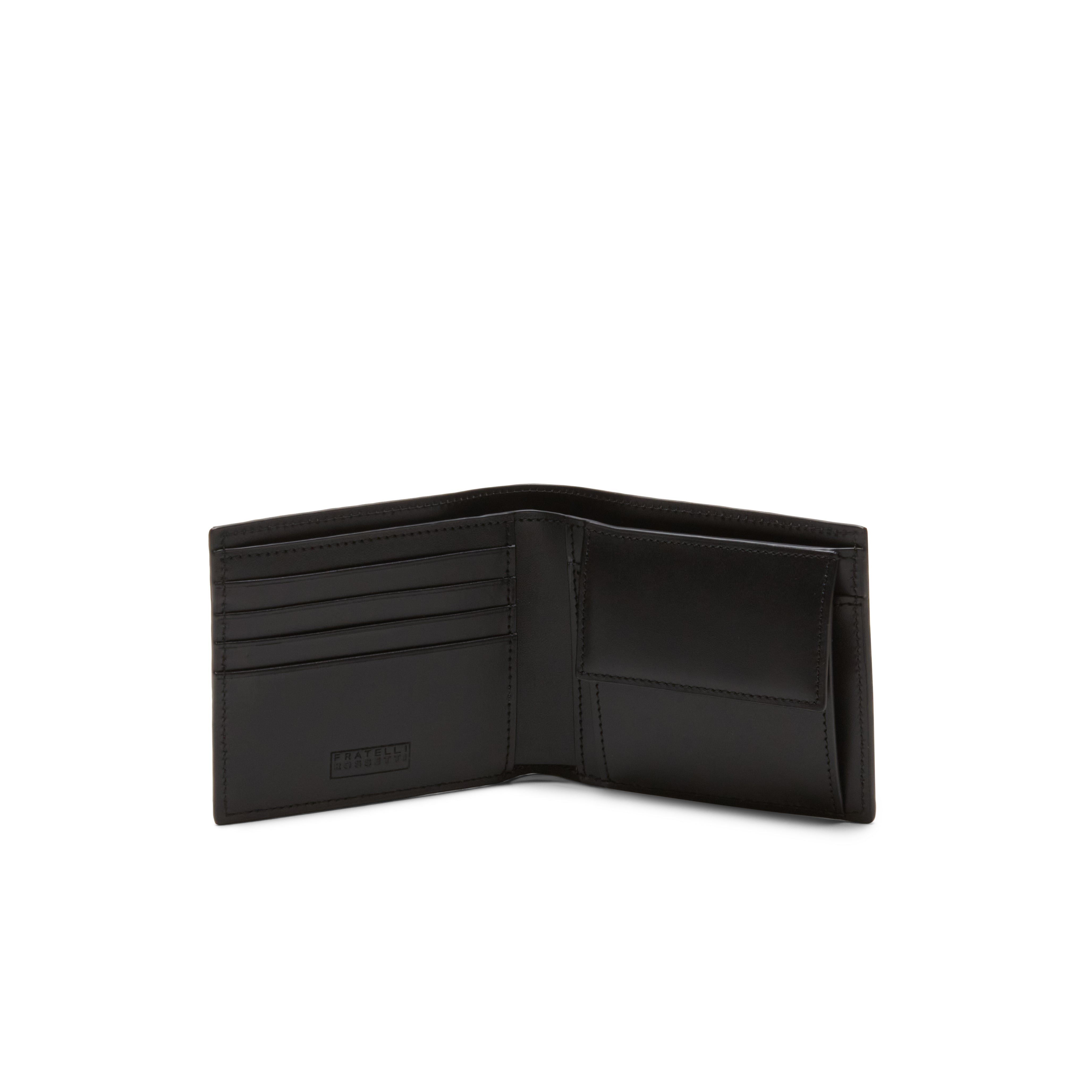 Portafoglio da uomo realizzato in morbida pelle nera, bottalata con grana visibile. Linterno è suddiviso in modo funzionale: una parte è costituita da quattro fessure per carte di credito o documenti, l'altra è dotata di una tasca portamonete con chiusura a bottone. Il portabanconote è comodamente suddiviso in due scomparti. Modello compatto che può essere comodamente riposto in una tasca.
