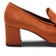 Femminilità e raffinatezza senza tempo caratterizzano il mocassino in morbida pelle scamosciata color cognac. I punti a mano che decorano la fascetta mettono in risalto i dettagli artigianali. Comodo tacco ricoperto altezza 60 mm. Suola in cuoio con inserto in gomma. br>Art. 68169