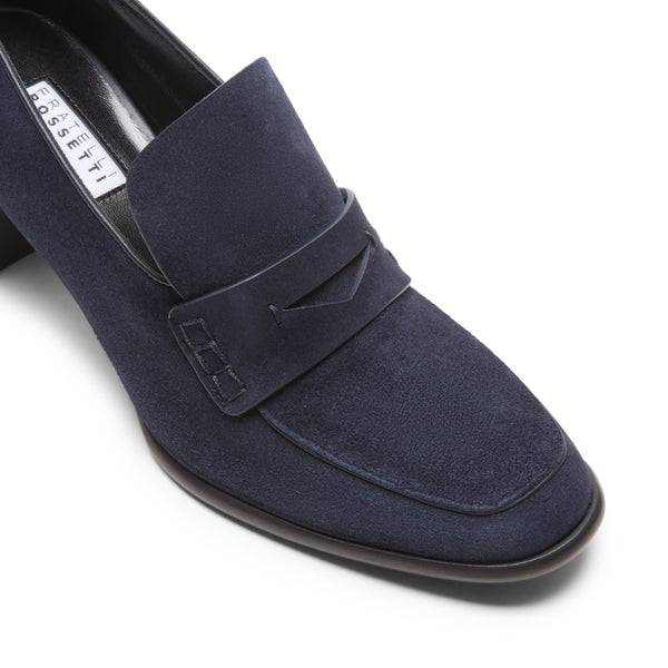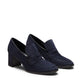 Femminilità e raffinatezza senza tempo caratterizzano il mocassino in morbida pelle scamosciata color blu navy. I punti a mano che decorano la fascetta mettono in risalto i dettagli artigianali. Comodo tacco ricoperto altezza 60 mm. Suola in cuoio con inserto in gomma. br>Art. 68169