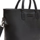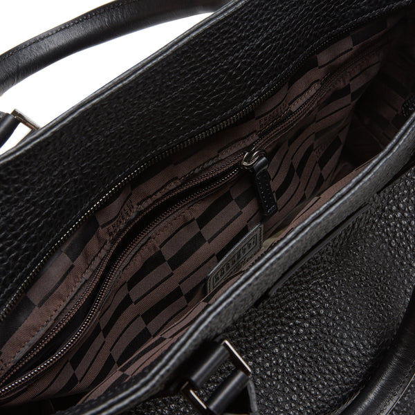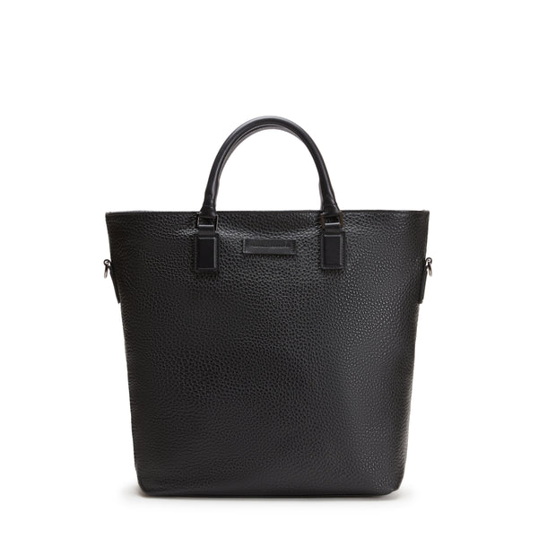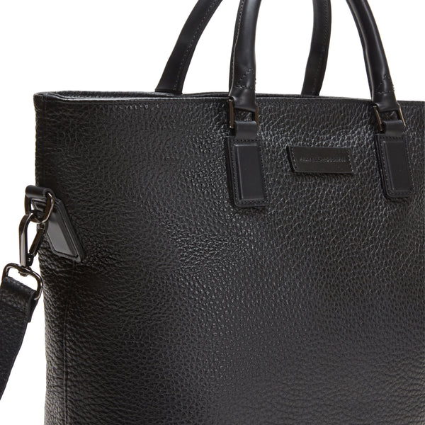 Tote bag dal design essenziale e strutturato, realizzata in pregiata pelle nera con grana visibile. Pratica e capiente, è dotata di doppi manici in pelle per un trasporto a mano e di una tracolla che consente anche un comodo utilizzo a spalla. Il logo impresso su un inserto in pelle tono su tono, conferisce un tocco raffinato. Linterno permette di contenere oggetti personali e device in modo ordinato, rendendola ideale sia per lufficio che per gli spostamenti urbani.