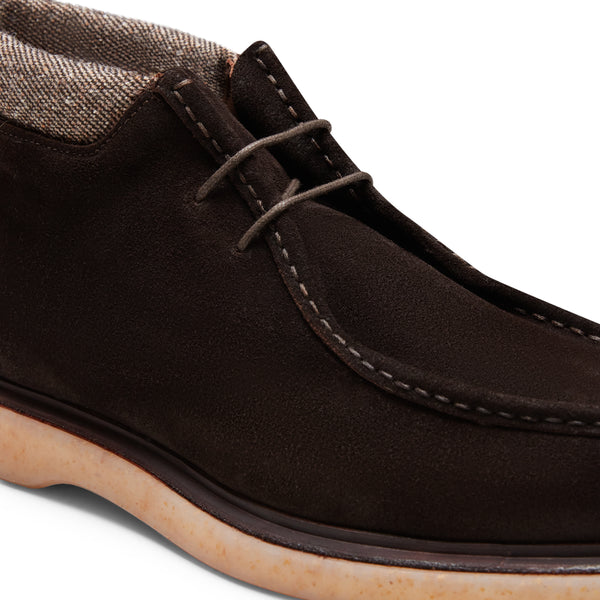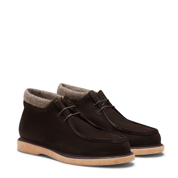 Bottine du désert raffinée à deux trous en daim doux couleur cacao. Une chaussure au look décontracté avec des détails élégants tels que la trépointe recouverte du même cuir que la tige et l'insert en tissu assorti. Semelle en caoutchouc souple et légère de couleur ambre.Art. 15131