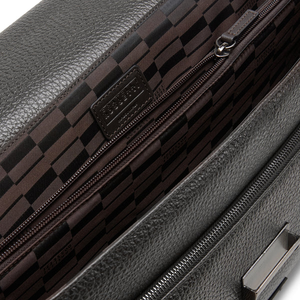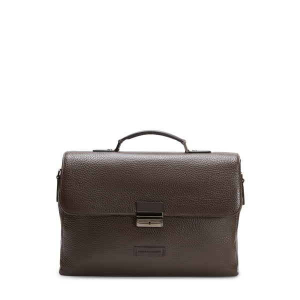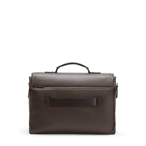 Cartella business realizzata in pelle marrone con grana visibile che combina estetica senza tempo e funzionalità. Il design essenziale e strutturato è valorizzato da una patta frontale con chiusura in metallo. Il logo impresso su un inserto in pelle tono su tono aggiunge un tocco raffinato. Allinterno, lo scomparto principale è suddiviso per contenere documenti e device in modo ordinato e facilmente accessibile. Può essere portata a mano tramite il manico superiore in pelle, oppure indossata a spalla grazie alla tracolla.