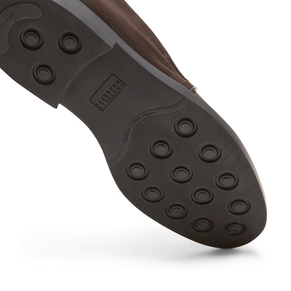 Desert boot d'inspiration anglo-saxonne, réalisée en daim souple couleur cacao avec traitement déperlant. Doté d'un profil en cuir assorti, parfait pour affronter l'hiver en alliant style raffiné et confort maximal. Semelle en caoutchouc personnalisée avec adhérence antidérapante.<br>Art. 44727