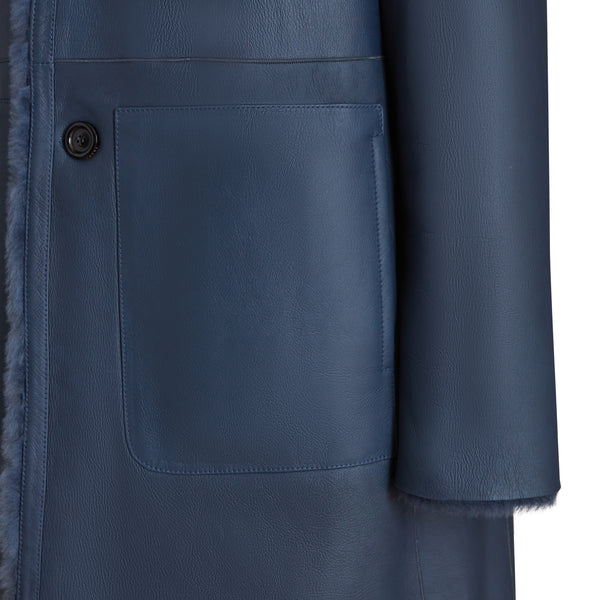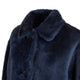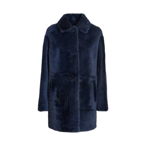 Cappotto reversibile realizzato in morbido shearling con leggera nappatura, color blu marine. Capo reversibile, femminile ed avvolgente. La chiusura con bottoni in corno naturale e il collo a camicia completano il look minimal e sartoriale.