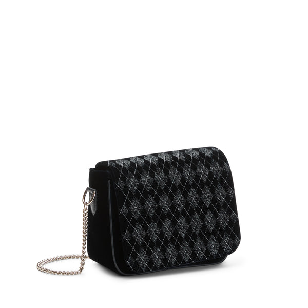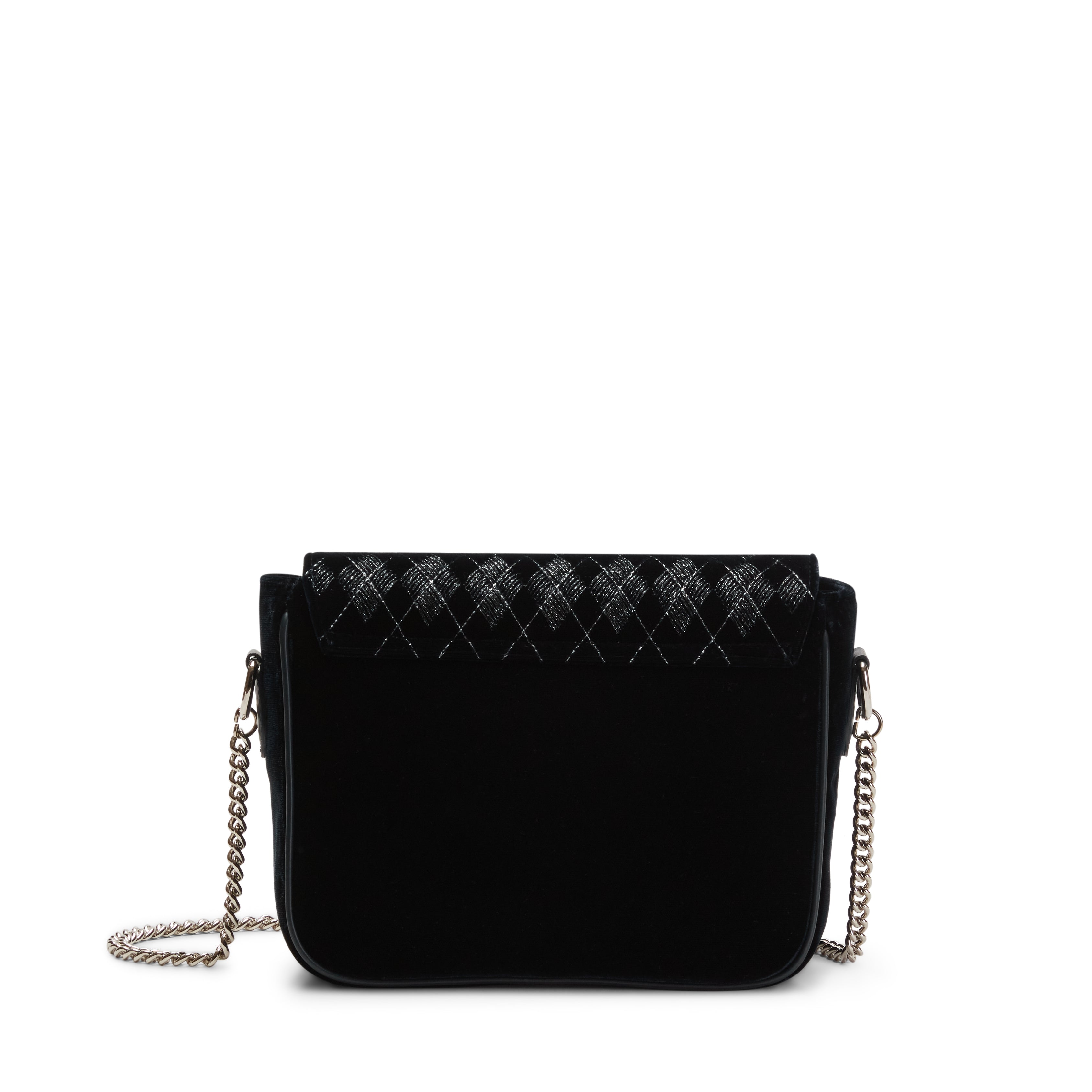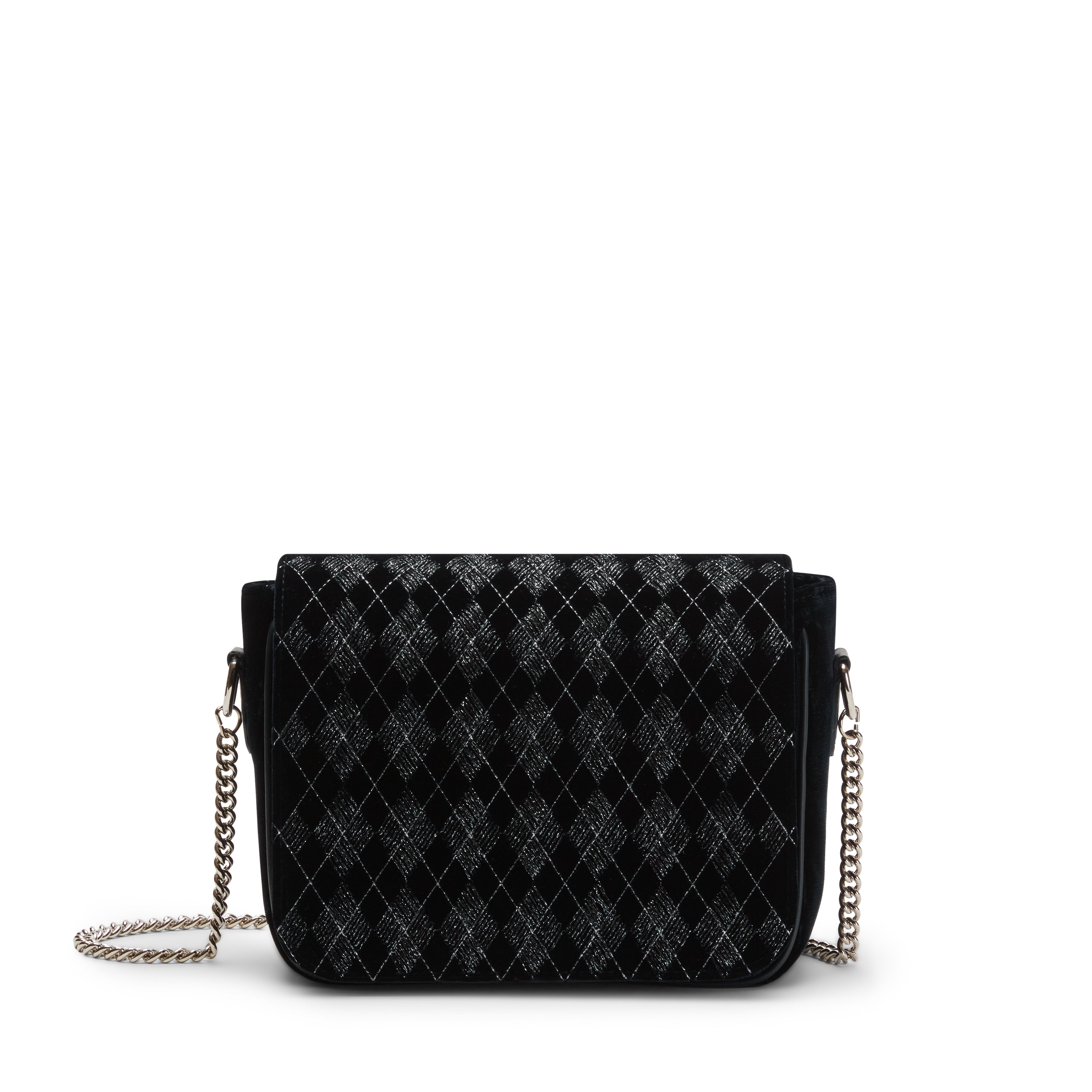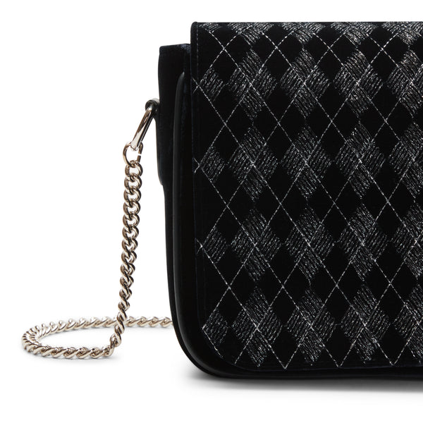 Elegante borsa cross body della linea Rossetti Décor in raffinato velluto blu marine caratterizzato da ricami geometrici e inserti in fili di lurex argentato, che aggiungono un delicato tocco di luce. Le linee essenziali completano il design ricercato, donando alla borsa un aspetto sofisticato.