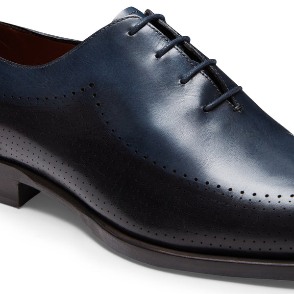 Richelieu raffinata ed esclusiva. Il pellame è tinto a mano tramite tamponatura e il sapiente lavoro artigianale crea una particolare sfumatura cromatica bicolore blu e nero, rendendo ogni paio unico. La calzatura è caratterizzata da bucature di diverse dimensioni che disegnano il fiore sul puntale e decorano la tomaia. Suola in cuoio bicolore.