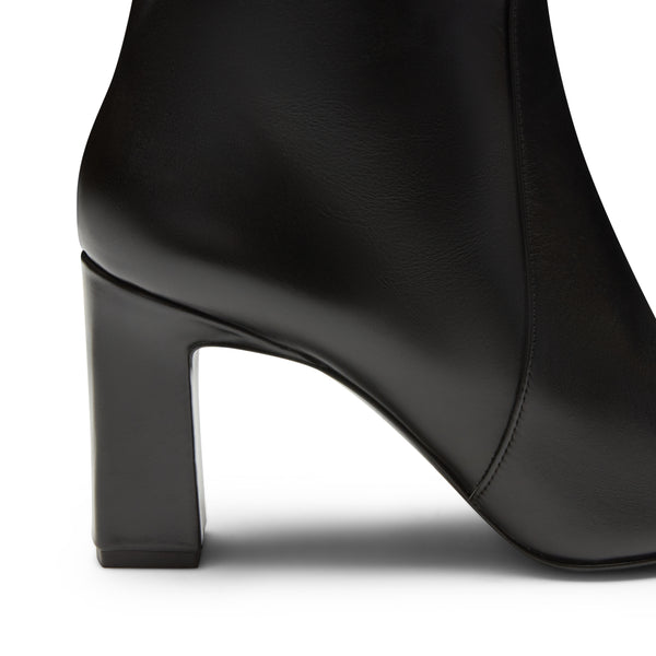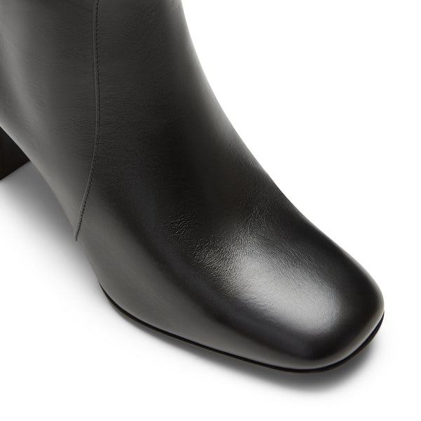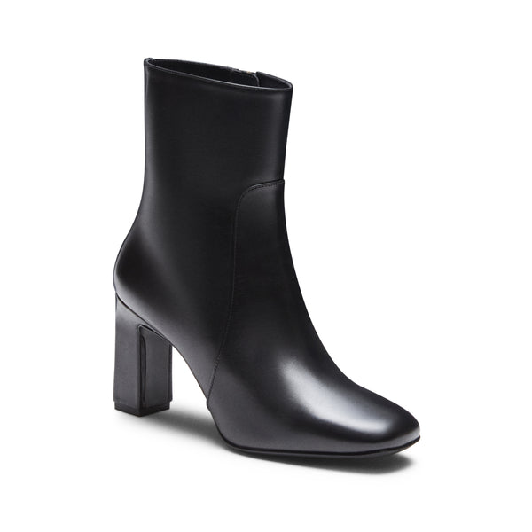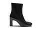 Rigore sartoriale e rifiniture artigianali definiscono il look sofisticato dello stivaletto a forma quadrata, realizzato in morbida pelle nera liscia con aspetto lucido. La zip laterale garantisce comfort nella calzata ed una perfetta vestibilità. Suola in cuoio con inserto in gomma. br>Art. 68166
