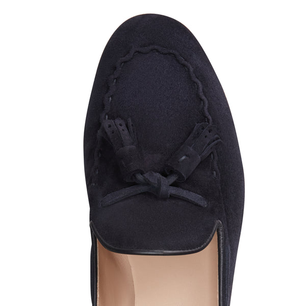 Mocassino Brera in suede blu, icona di eleganza senza tempo ed innovazione, diventa protagonista della collezione estiva grazie alla cucitura 'punto a bambola'. Questa tecnica esalata la maestria artigianale, il filo viene teso e lavorato per creare un effetto a serpentina che dona dinamismo e tridimensionalità alla calzatura.