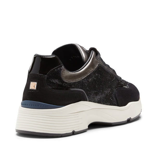 Sneaker dal look dinamico caratterizzata da un ricercato accostamento di materiali, il tessuto con effetto cavallino abbinato a suede e pelle laminata nei toni del nero brillante e antracite. Calzatura che richiama il concetto di sportswear, per chi cerca la comodità di un outfit sportivo senza rinunciare ad un tocco glamour. Suola in gomma extra light bicolore.