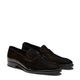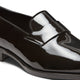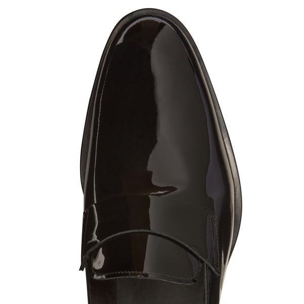 Eleganter Slipper mit Riemen aus weichem schwarzen Lackleder. Das schlichte Design verleiht in Kombination mit dem glänzenden Leder schwarzen Black-Tie-Outfits eine exklusive Note. Auf Futter und Obermaterial farblich abgestimmte, schwarze Ledersohle.