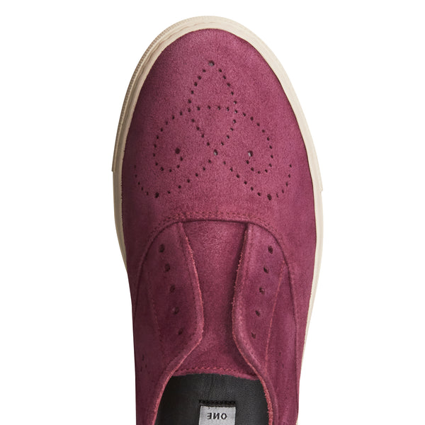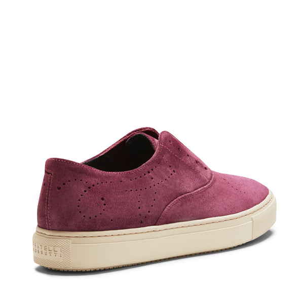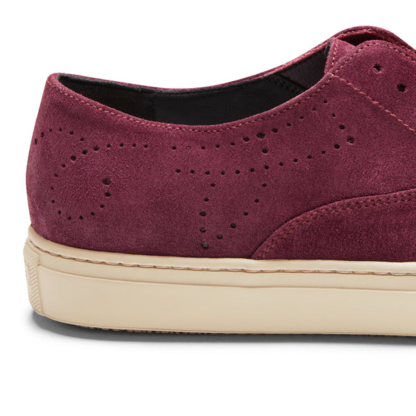 Kultiger Hobo Sport-Sneaker mit perforierten Details aus weichem pflaumenfarbenem Wildleder mit wasserabweisender Behandlung. Dieser lässige und zugleich edle Schuh mit Kastensohle lässt sich dank praktischer Gummizüge im Inneren auch ohne Schnürsenkel tragen. Gummisohle mit speziellem, rutschfestem Profil.