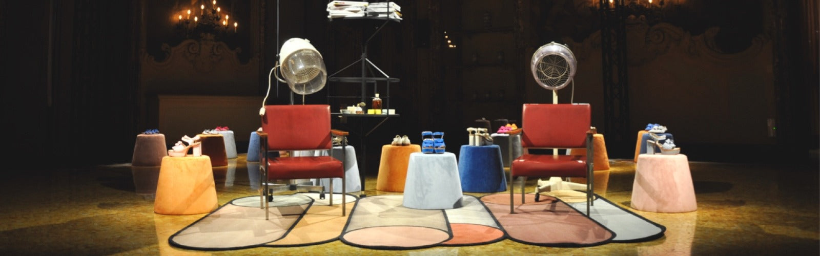 During Milan Fashion Week, the atmosphere at the presentation called to mind the pleasantly relaxing ambience of a beauty parlour. CC-Tapis 100% hand-knotted rugs by Patricia Urquiola were used for the occasion. The Spanish artist’s abstract graphics and the magazine holders by the Italian designer Pietro Russo helped to recreate the atmosphere of a 1950s salon.