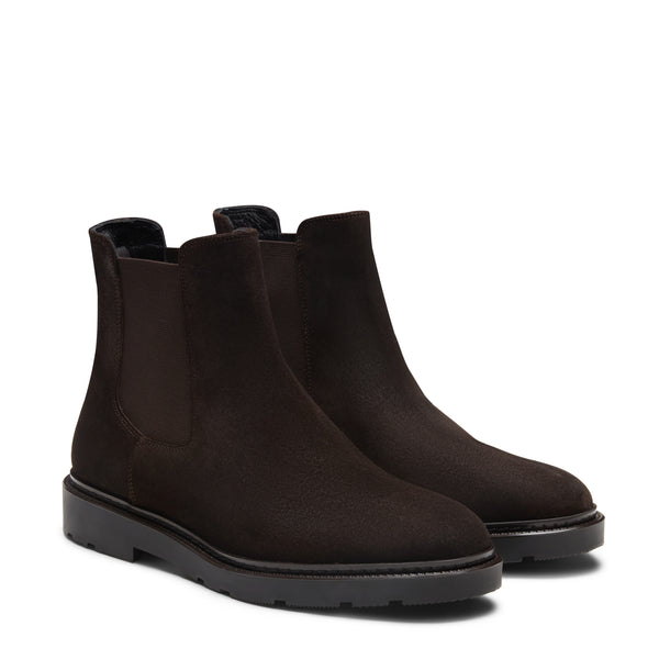 Beatles ankle boots with accentuated edge and rounded shape, made of cocoa-colored suede. A model with a distinctive character, which combines versatility and essential style. The elastic sides ensure a comfortable fit. Polyurethane sole with hand-stitched welt, featuring a soft and flexible top layer for foot comfort, while the tread ensures durability and a non-slip grip.