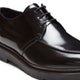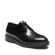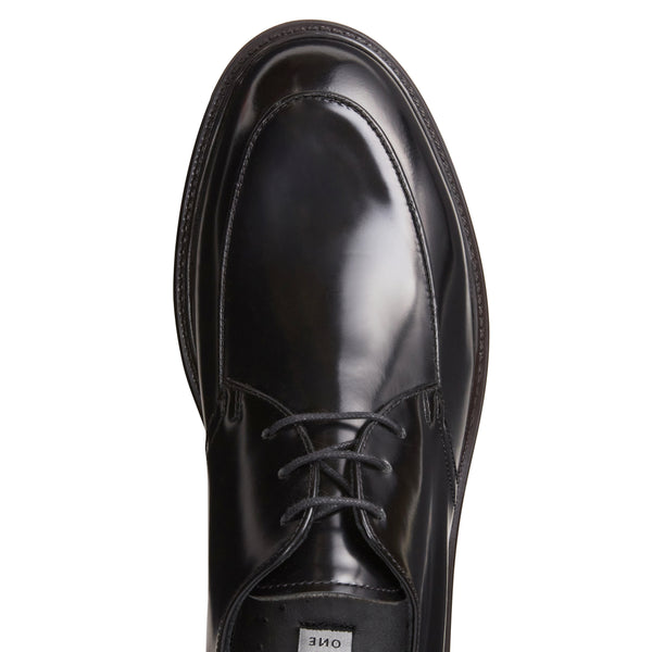 Derby shoe with vamp crafted from sleek black leather, finished with a subtle brushing that enhances its lustre. Footwear with a timeless and refined style, the perfect blend of formal elegance and distinctive character. Polyurethane sole with hand-stitched welt, featuring a supple and flexible top layer for foot comfort, while the tread offers durability and a non-slip grip.