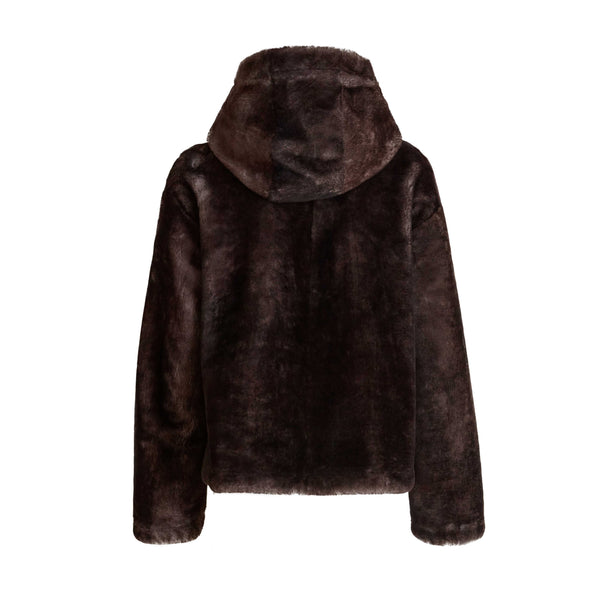 Bomber in morbido shearling reversibile dalla texture morbida e avvolgente. Il design pulito fa risaltare lalternanza cromatica del pellame bicolore che vira da una base grigia fino alle estremità più scure, creando un effetto di movimento raffinato e distintivo. Completano il look la chiusura con zip centrale e l'ampio cappuccio.