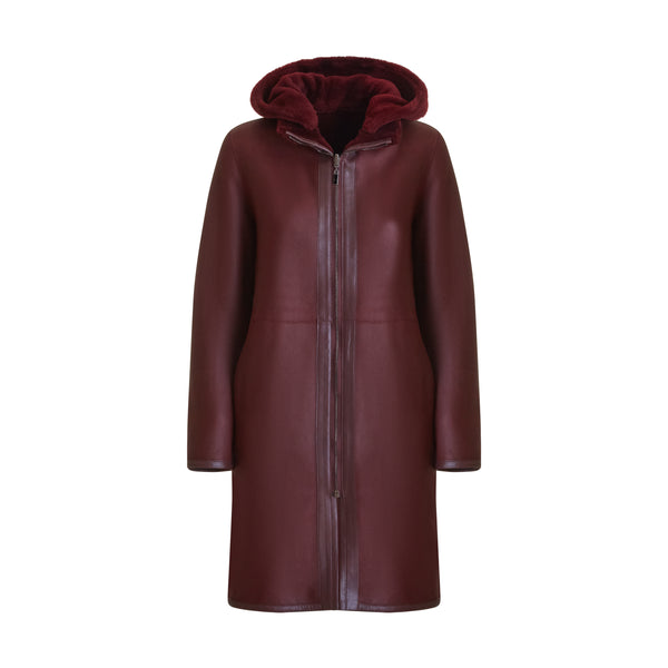 Raffinato cappotto reversibile realizzato in morbido shearling nappato in brillante color bordeaux. Caratterizzato da un ampio cappuccio rimovibile, le maniche lunghe sono rifinite a taglio vivo e facilmente risvoltabili. Design essenziale con chiusura centrale con zip metallica. Il capo ha una vestibilità regolare.