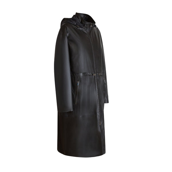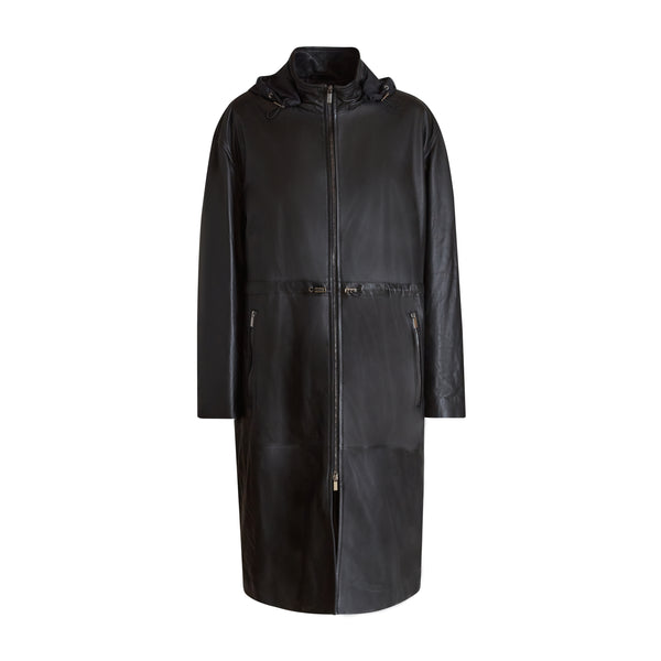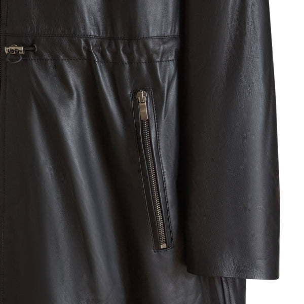 Parka con cappuccio realizzato in morbida nappa nera con leggero effetto tamponato. Modello casual e femminile che si caratterizza per la sua silhouette ampia, regolabile tramite la coulisse in vita. Si può interpretare più slim o più over scegliendo tra le tre taglie disponibili S M L.