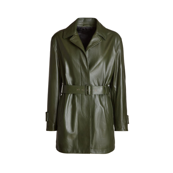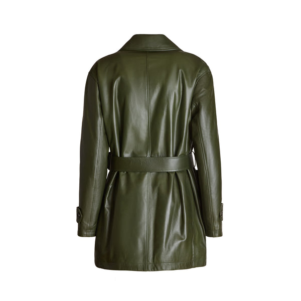 Indispensabile per la stagione autunnale, il trench coat è il capo classico e senza tempo. Realizzato in morbida nappa di colore verde con leggero effeto tamponato. Capo dal design pulito, con bottoni in corno naturale nascosti dalla patta centrale. La cintura coordinata, con fibbia ricoperta in pelle, valorizza la silhouette di chi lo indossa.