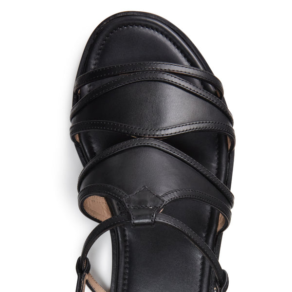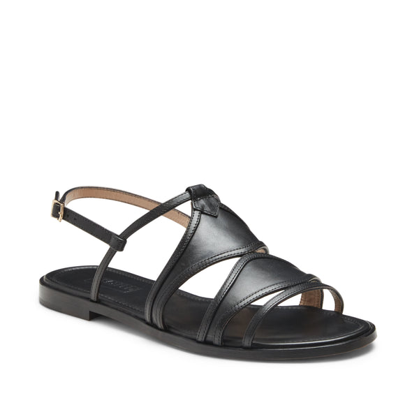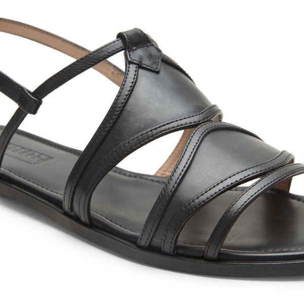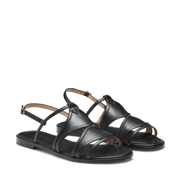 Flat sandal with a feminine and sophisticated look, made of soft black leather. The semi-high top and ankle strap give it a sexy and dynamic allure.
