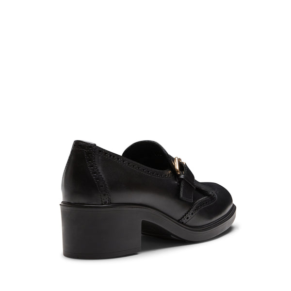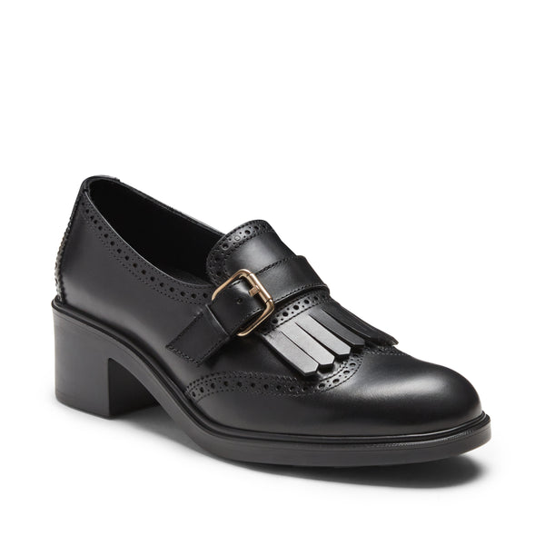 Mocassino con disegno brogue che interpreta un moderno look androgino. Realizzato in pelle liscia nera con leggero effetto anticato, si caratterizza per la frangia e la fibbia con ardiglione in metallo. La suola dalla forma arrotondata in gomma extralight con tacco 40 mm lo rende versatile must have per la stagione invernale.