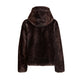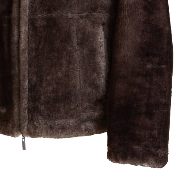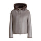 Bomber in morbido shearling reversibile dalla texture morbida e avvolgente. Il design pulito fa risaltare lalternanza cromatica del pellame bicolore che vira da una base grigia fino alle estremità più scure, creando un effetto di movimento raffinato e distintivo. Completano il look la chiusura con zip centrale e l'ampio cappuccio.