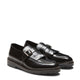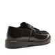 Mocasín de forma redondeada realizado en piel lisa negra con acabado con cepillado abrasivo que le aporta brillo. Se caracteriza por la presencia de flecos y hebilla, una combinación perfecta de apariencia formal y diseño distintivo. Suela de poliuretano con vira cosida a mano, caracterizada por una capa superior suave y flexible para la comodidad del pie, mientras que el dibujo garantiza robustez y agarre antideslizante.