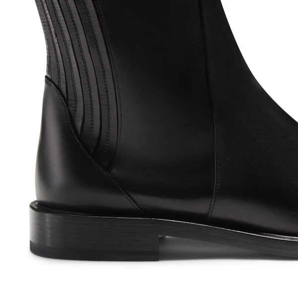Bota caracterizada por líneas esenciales y realizada en piel lisa acabada con cepillado pulido. El rigor sartorial y los acabados artesanales definen su aspecto varonil y sofisticado. Suela de cuero con inserto de goma.
