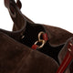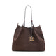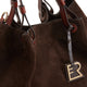 Edle Tragetasche aus der Linie Royal aus kakaofarbenem Wildleder mit glatten Ledergriffen und Kontrastnähten. Es ist weich und geräumig und in zwei Fächer unterteilt, die durch eine zentrale Reißverschlusstasche getrennt sind. Verziert mit dem dreidimensionalen goldenen R-Logo-Anhänger, dem unverwechselbaren Symbol des Hauses<br>Art. 84700